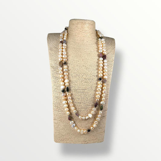 Collana lunga con perle di acqua dolce rosa e tormalina